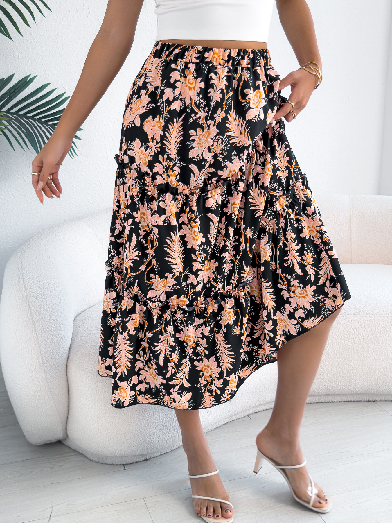 This ruffled midi skirt blends elegance, comfort, and timeless style—an essential piece for a refined and feminine wardrobe.