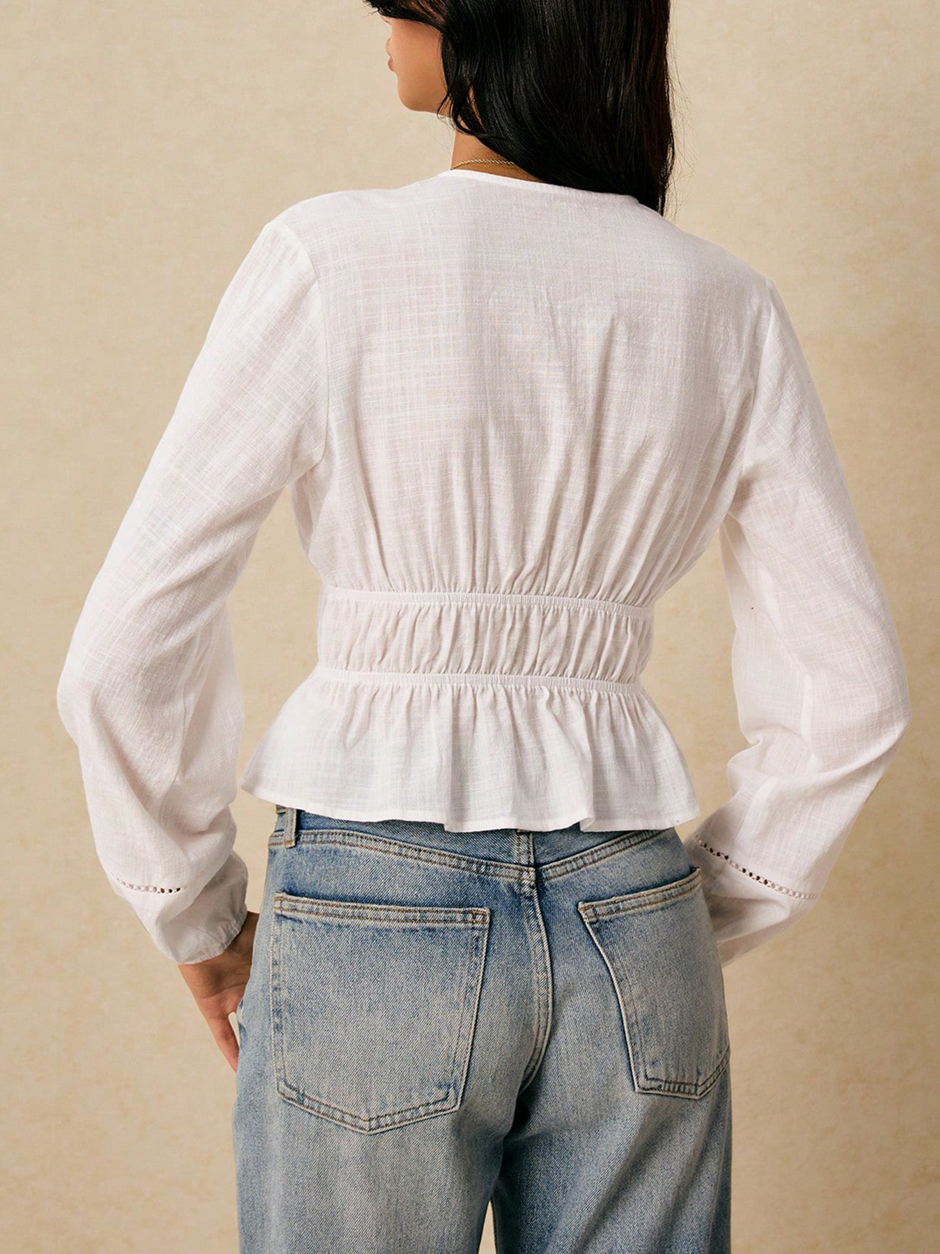 Effortlessly stylish and versatile, this white long-sleeve top features a subtle drawstring detail that adds a touch of modern flair to a timeless casual silhouette. Designed for comfort and polished everyday wear, it pairs beautifully with trousers, skirts, or layered over dresses for a refined look.