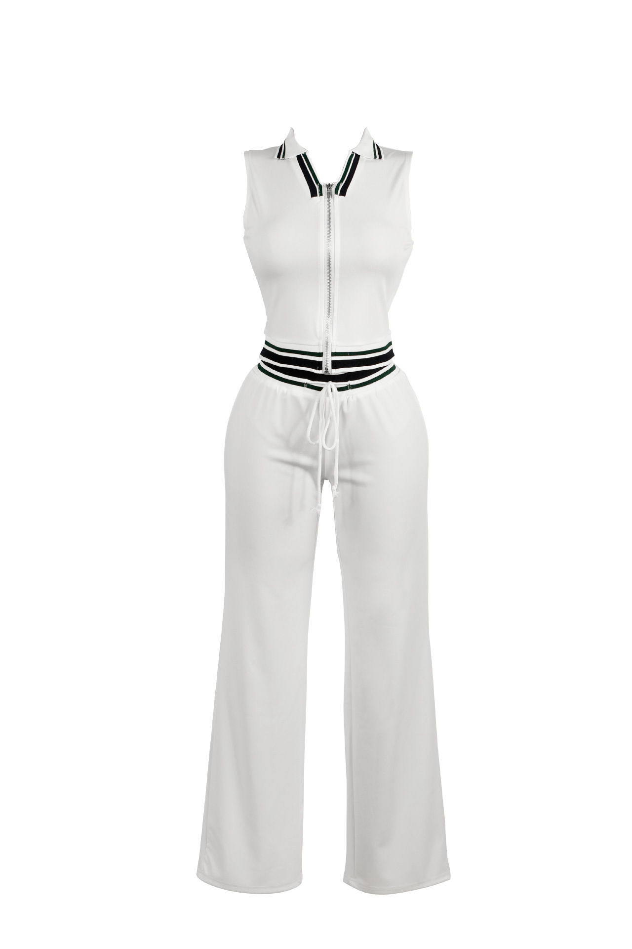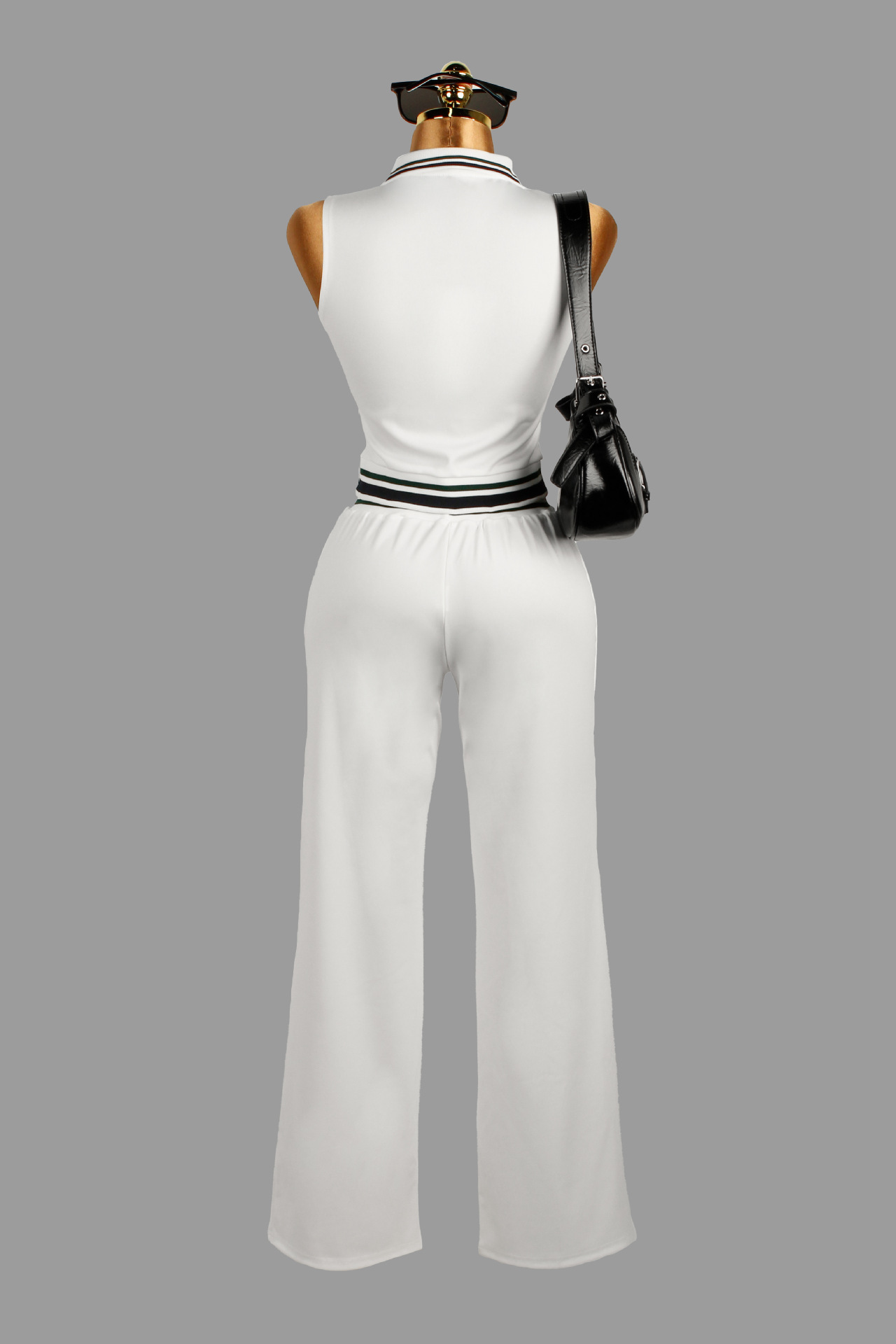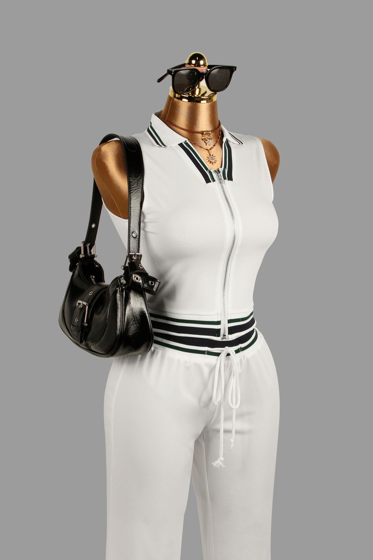 - Design: Sleeveless top with coordinating short skirt or full-length trousers for a polished, modern look